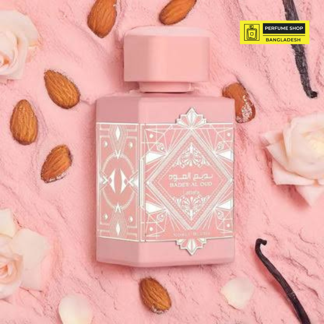 Experience the allure of Lattafa Badee Al Oud Noble Blush – a luxurious Eau de Parfum featuring notes of rose milk, almond, meringue, vanilla, sandalwood, and musk. Perfect for women seeking a sweet, creamy, and floral fragrance.