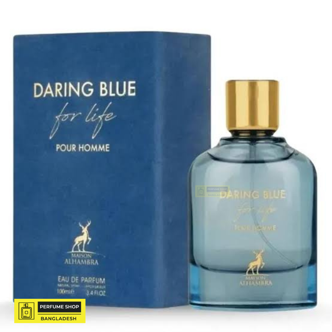 Discover Maison Alhambra Daring Blue For Life Eau de Parfum. A refreshing blend of citrus, ozonic, and woody notes. Perfect for daily wear.